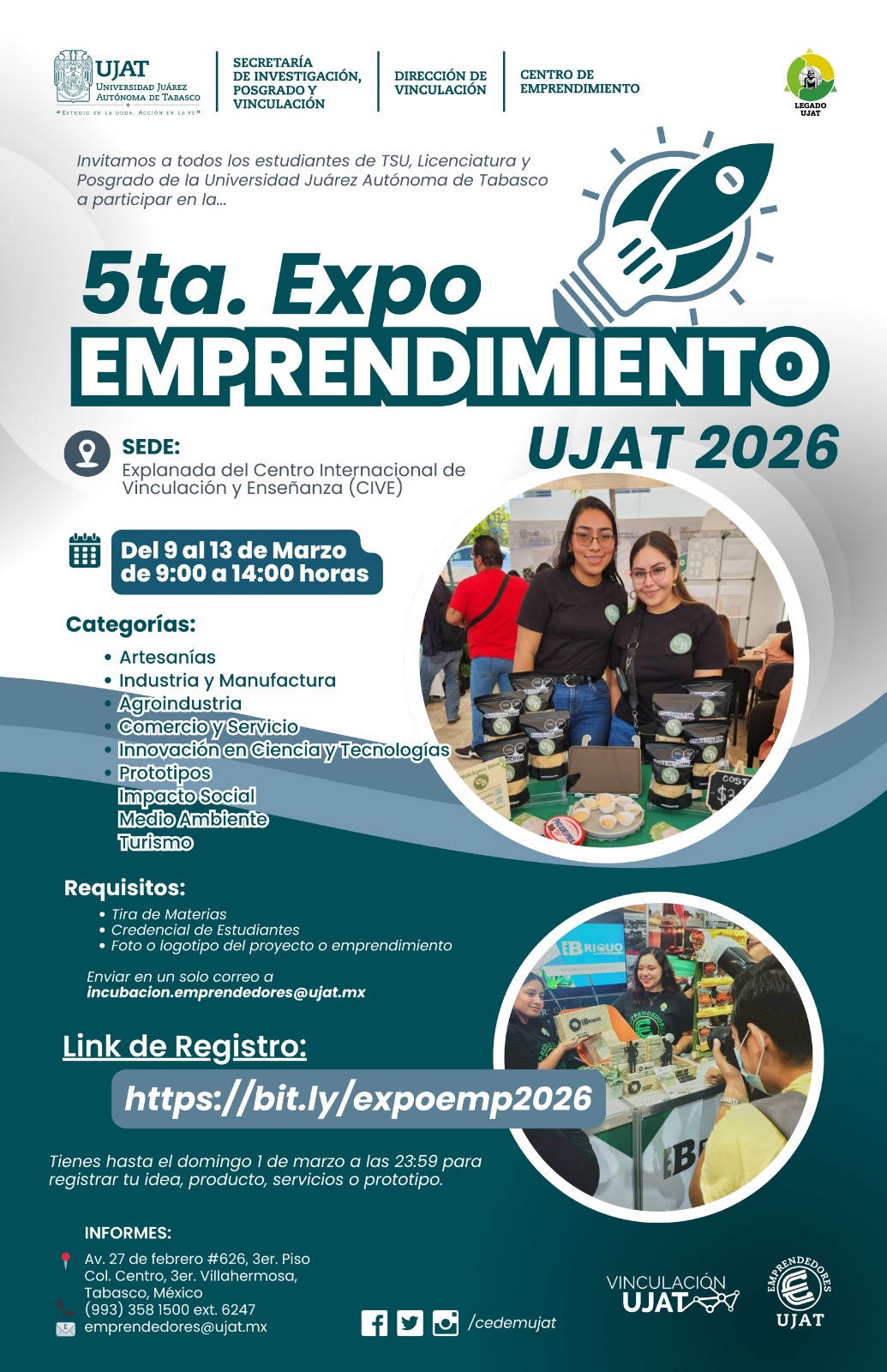La 5ta. Expo Emprendimiento UJAT 2026 es un espacio destinado a promover la innovación y el espíritu emprendedor de la comunidad universitaria. Estudiantes y egresados presentan proyectos, productos o servicios con potencial de desarrollo, fortaleciendo sus habilidades y generando oportunidades de vinculación académica y productiva.
